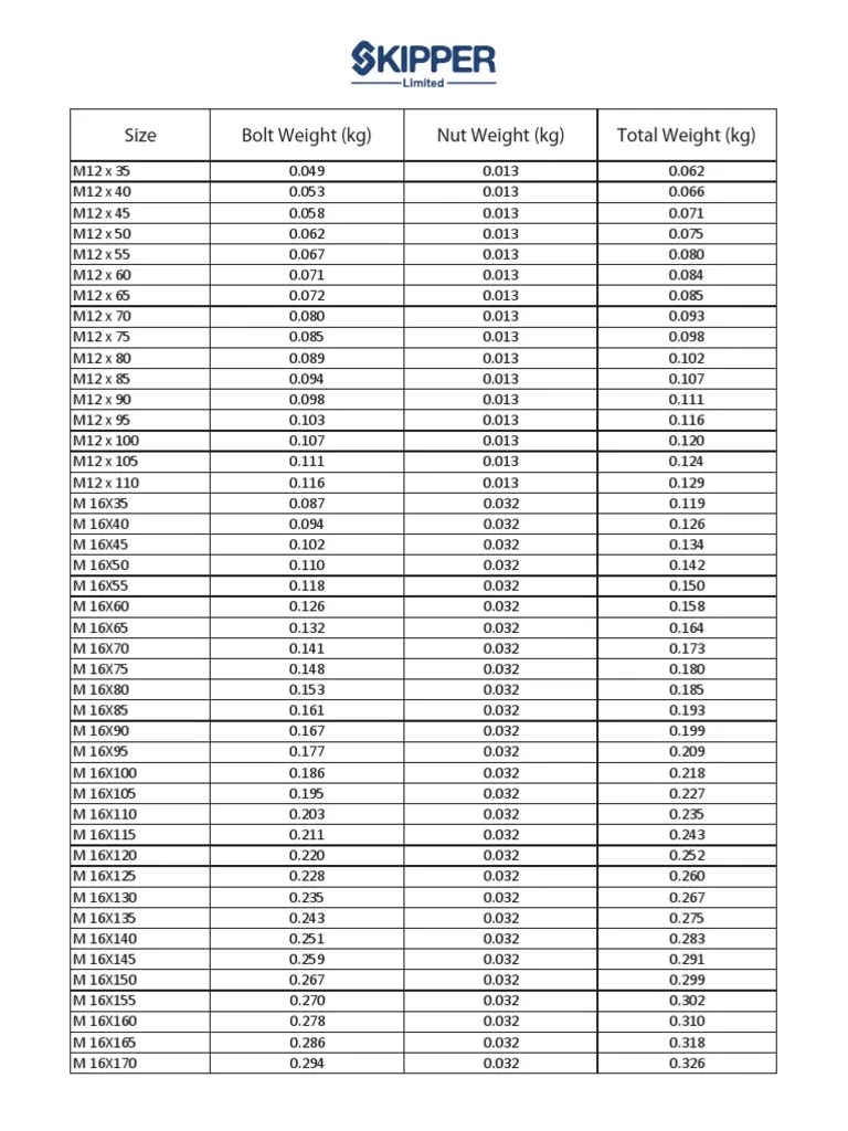 Chart only works with standard metric structural bolts, grade 4.6 or 8.8 nuts and hard flat washers.